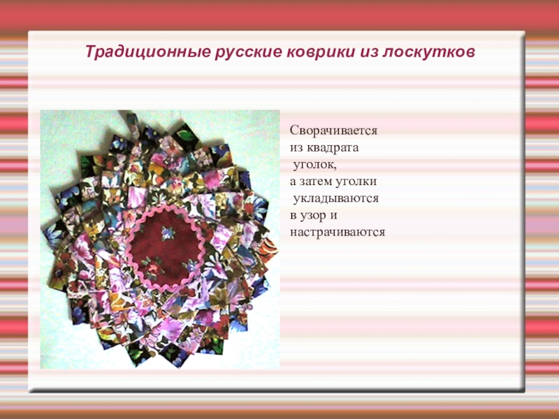 Одним из первых предметов быта были лоскутные одеяла, коврики-кругляши, дорожки, сотканные из полосок ткани.
