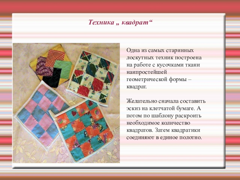 с кусочками ткани наипростейшей геометрической формы – квадрат.