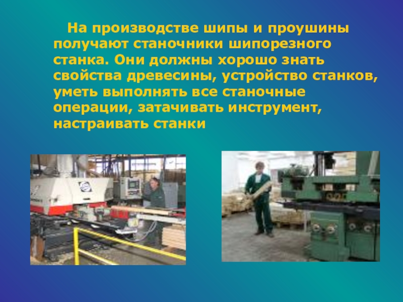Слайд 9 На производстве шипы и проушины получают станочники шипорезного станка.
