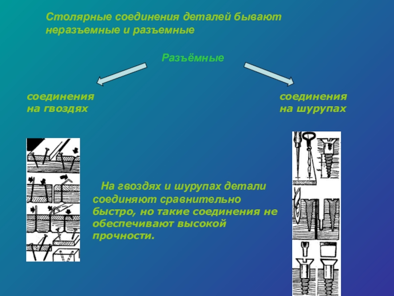 Столярные соединения деталей бывают неразъемные и разъемные На гвоздях и шурупах детали соединяют сравнительно быстро, но такие соединения не обеспечивают высокой прочности.соединения на гвоздяхсоединения на шурупахРазъёмные