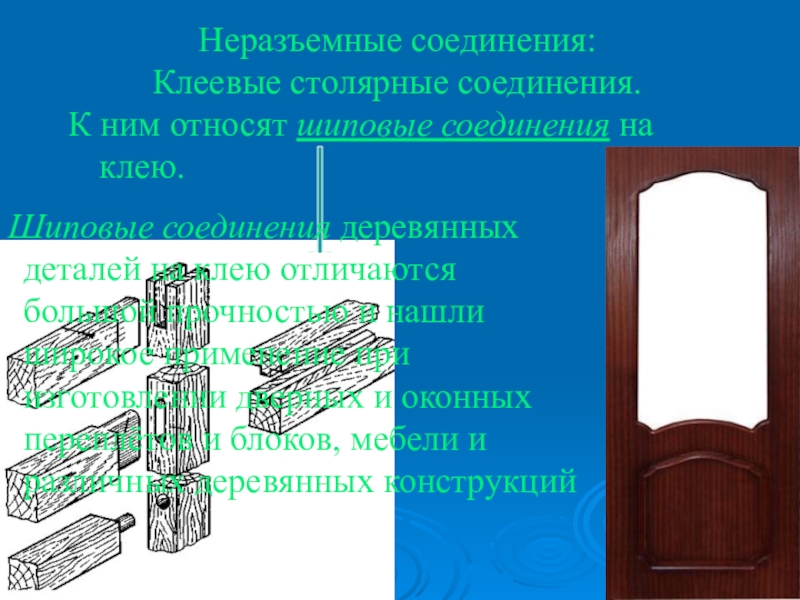 Неразъемные соединения:Клеевые столярные соединения. К ним относят шиповые соединения на клею.Шиповые соединения деревянных деталей на клею отличаются