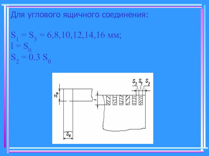 Слайд 8Для углового ящичного соединения: S1 = S3 = 6,8,10,12,14,16 мм; l = S0