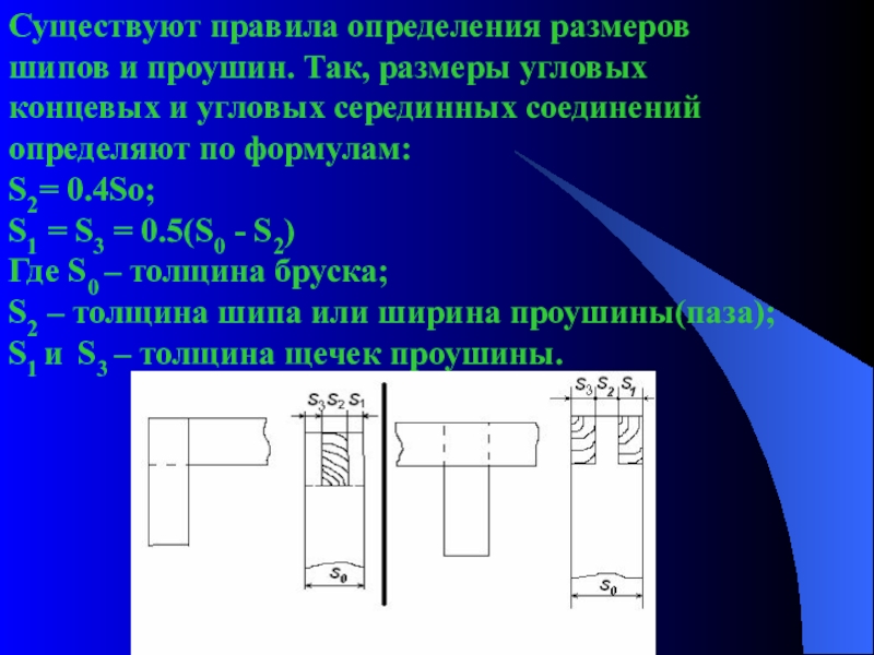 Слайд 7Существуют правила определения размеров шипов и проушин. Так, размеры угловых концевых