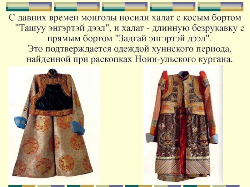 дээл", и халат - длинную безрукавку с прямым бортом "Задгай энгэртэй дээл". Это подтверждается одеждой хуннского периода, найденной при раскопках Ноин-ульского кургана.