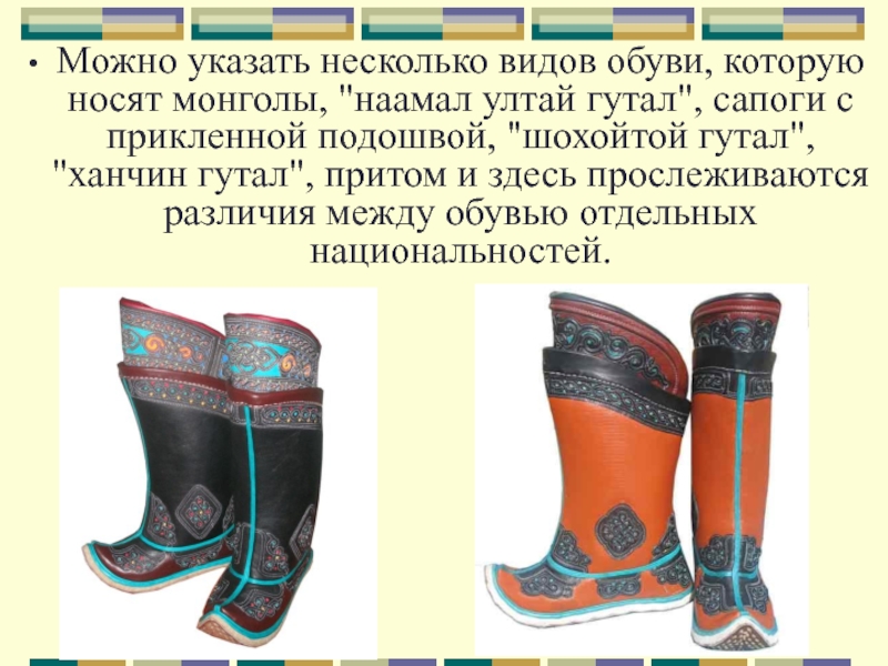 Слайд 14Можно указать несколько видов обуви, которую носят монголы, "наамал ултай гутал",