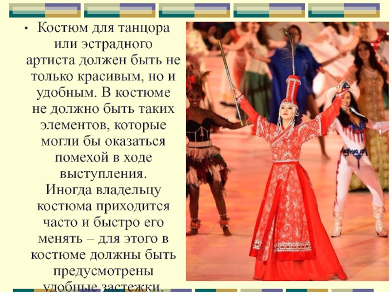Слайд 7Костюм для танцора или эстрадного артиста должен быть не только красивым, но