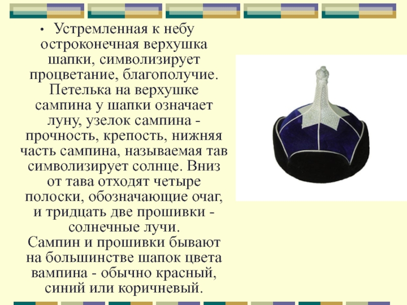 Слайд 13Устремленная к небу остроконечная верхушка шапки, символизирует процветание, благополучие. Петелька на