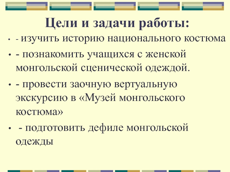 - провести заочную вертуальную экскурсию в «Музей монгольского костюма»