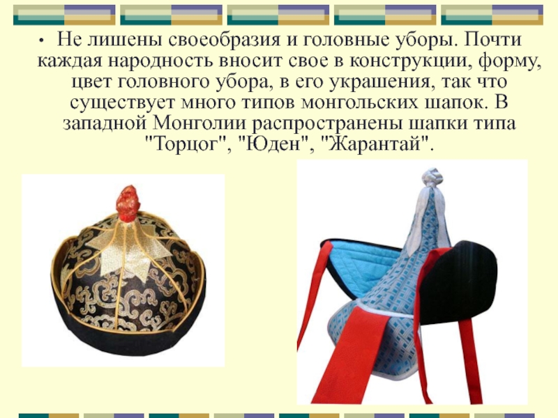в конструкции, форму, цвет головного убора, в его украшения, так что существует много типов монгольских шапок. В западной Монголии распространены шапки типа "Торцог", "Юден", "Жарантай".