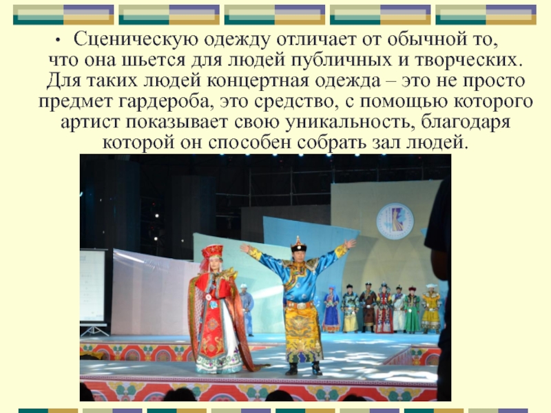 Слайд 5Сценическая одежда – это одежда, которая предназначена для публичных выступлений,