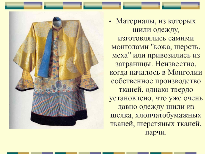 или привозились из заграницы. Неизвестно, когда началось в Монголии собственное производство тканей, однако твердо установлено, что уже очень давно одежду шили из шелка, хлопчатобумажных тканей, шерстяных тканей, парчи.