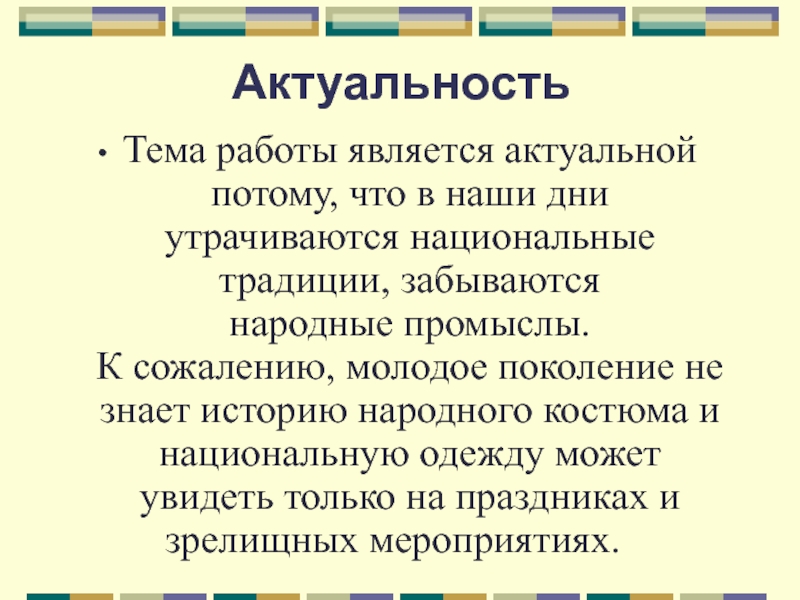 национальные традиции, забываются народные промыслы. К сожалению, молодое поколение не знает историю народного костюма и национальную одежду может увидеть только на праздниках и зрелищных мероприятиях.
