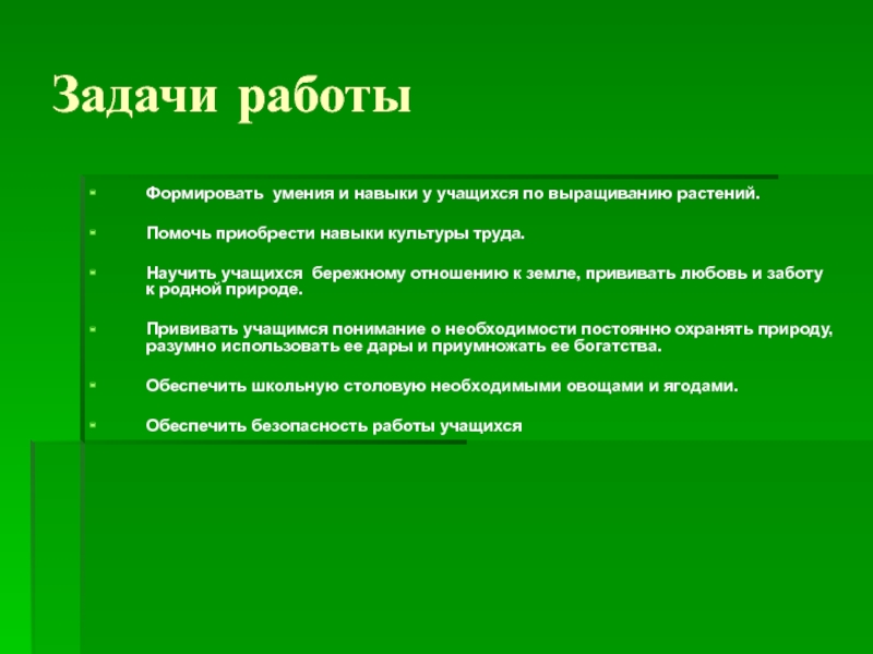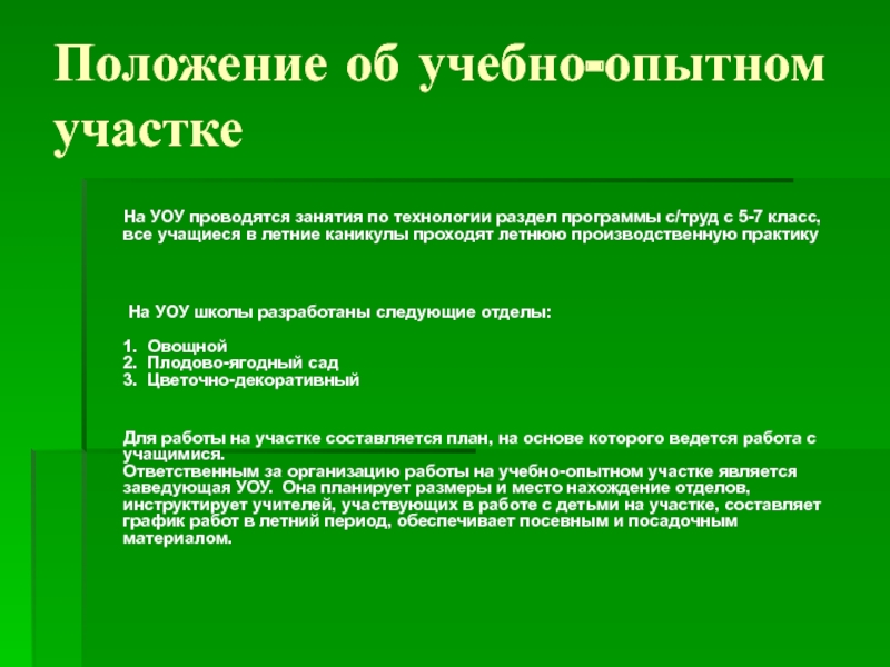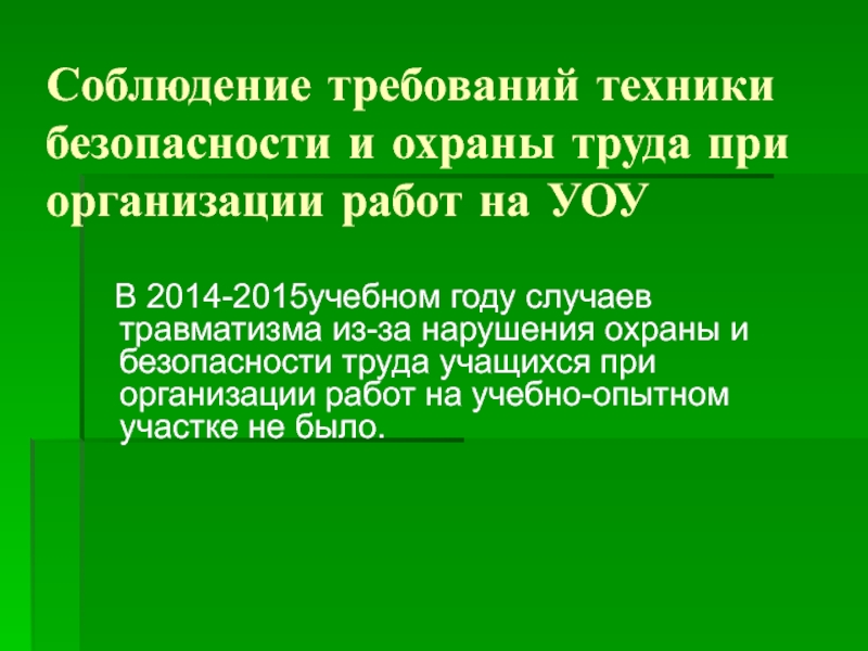 В 2014-2015учебном году случаев травматизма из-за нарушения охраны и безопасности труда учащихся при организации работ на учебно-опытном участке не было.