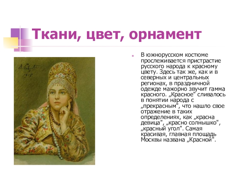 красному цвету. Здесь так же, как и в северных и центральных регионах, в праздничной одежде мажорно звучит гамма красного. „Красное" сливалось в понятии народа с „прекрасным", что нашло свое отражение в таких определениях, как „красна девица", „красно солнышко", „красный угол". Самая красивая, главная площадь Москвы названа „Красной".