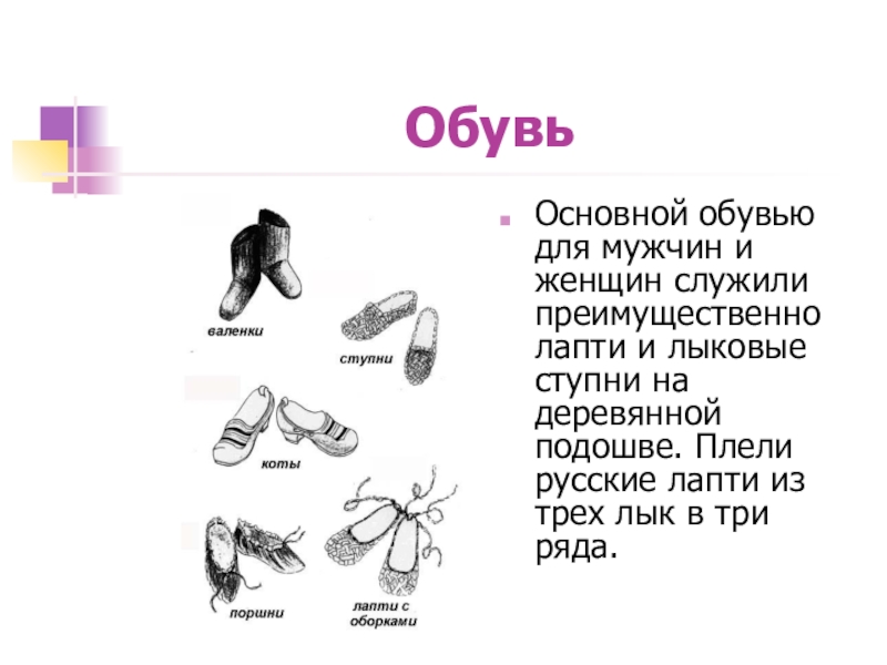Основной обувью для мужчин и женщин служили преимущественно лапти и лыковые