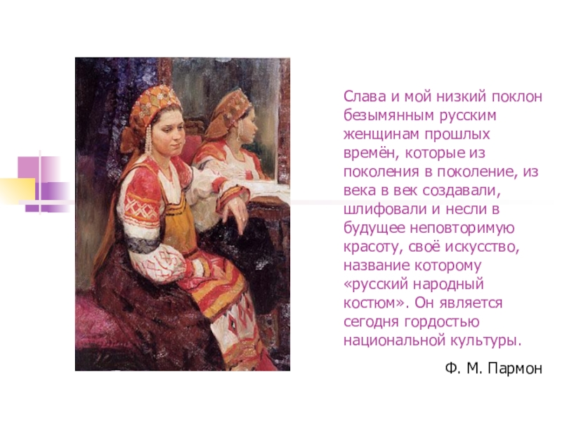 из поколения в поколение, из века в век создавали, шлифовали и несли в будущее неповторимую красоту, своё искусство, название которому «русский народный костюм». Он является сегодня гордостью национальной культуры.