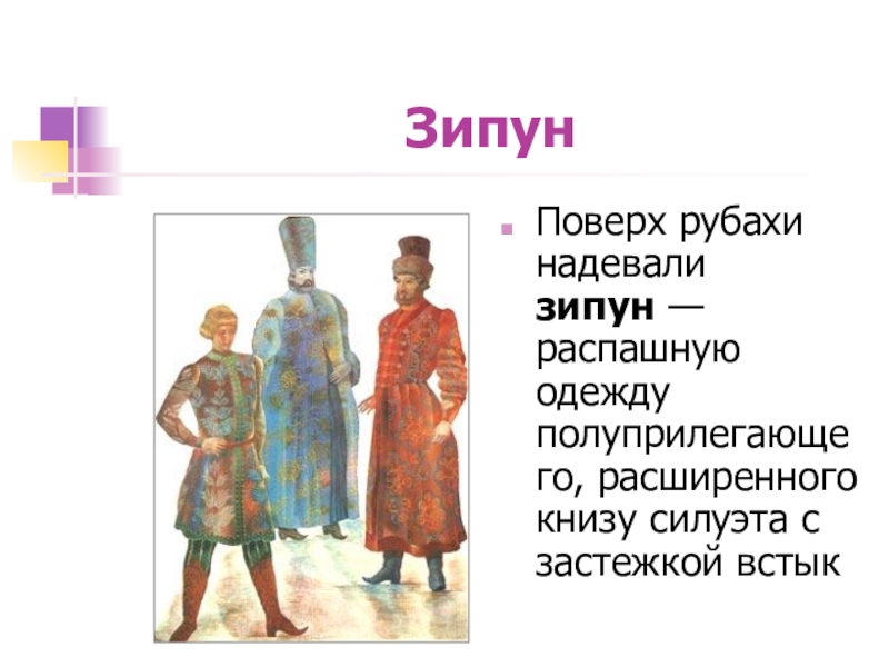 Поверх рубахи надевали зипун — распашную одежду полуприлегающего, расширенного книзу силуэта с