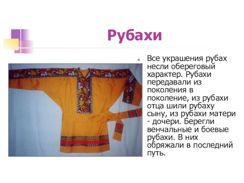 поколение, из рубахи отца шили рубаху сыну, из рубахи матери - дочери. Берегли венчальные и боевые рубахи. В них обряжали в последний путь.