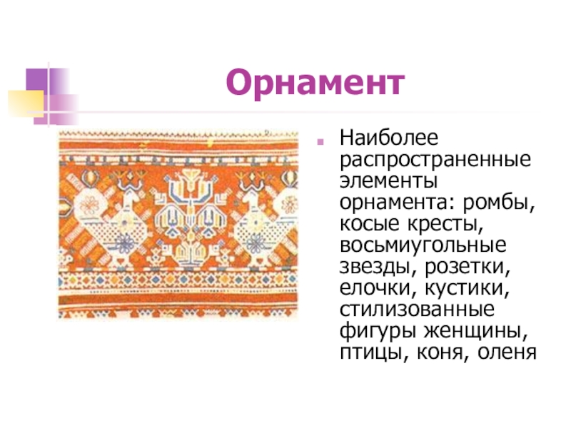 Наиболее распространенные элементы орнамента: ромбы, косые кресты, восьмиугольные звезды, розетки, елочки,