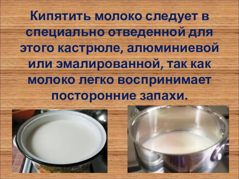 Слайд 9Кипятить молоко следует в специально отведенной для этого кастрюле, алюминиевой или