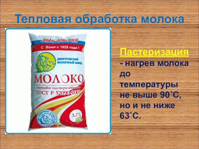 Тепловая обработка молокаПастеризация - нагрев молока до температуры не выше 90˚С, но и не ниже 63˚С.