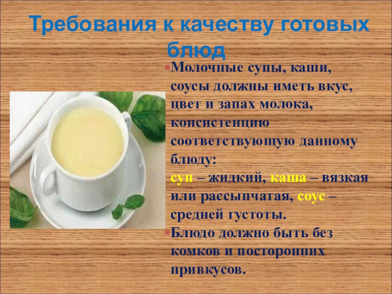 Требования к качеству готовых блюдМолочные супы, каши, соусы должны иметь вкус, цвет и запах молока, консистенцию соответствующую