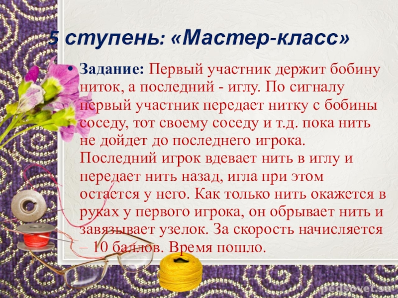 5 ступень: «Мастер-класс» Задание: Первый участник держит бобину ниток, а последний - иглу. По сигналу первый