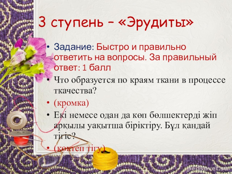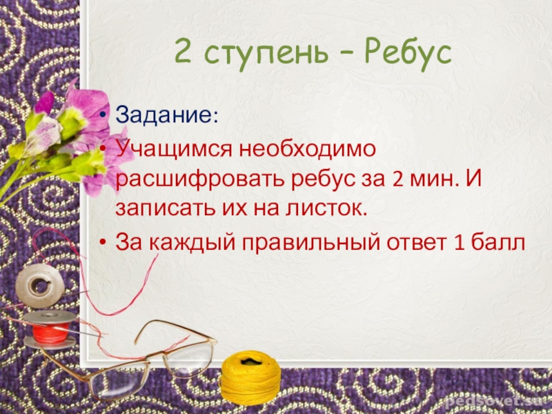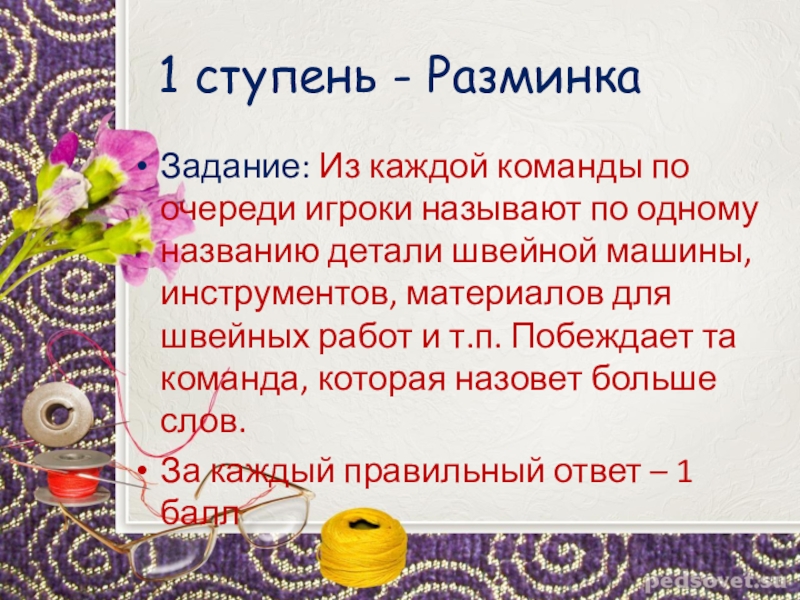 1 ступень - РазминкаЗадание: Из каждой команды по очереди игроки называют по одному названию детали швейной машины, инструментов, материалов для швейных работ и т.п. Побеждает та команда, которая назовет больше слов. За каждый правильный ответ –