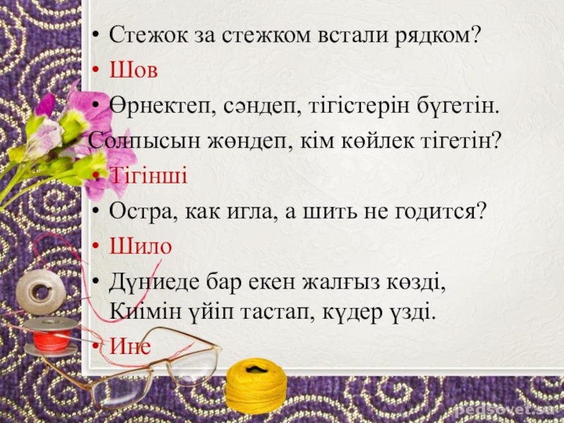 Стежок за стежком встали рядком? Шов Өрнектеп, сәндеп, тігістерін бүгетін.Солпысын жөндеп, кім көйлек тігетін?Тігінші Остра, как игла,