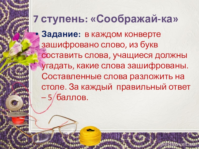 7 ступень: «Соображай-ка» Задание: в каждом конверте зашифровано слово, из букв составить слова,