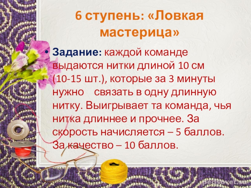 6 ступень: «Ловкая мастерица»Задание: каждой команде выдаются нитки длиной 10 см (10-15 шт.), которые за 3 минуты