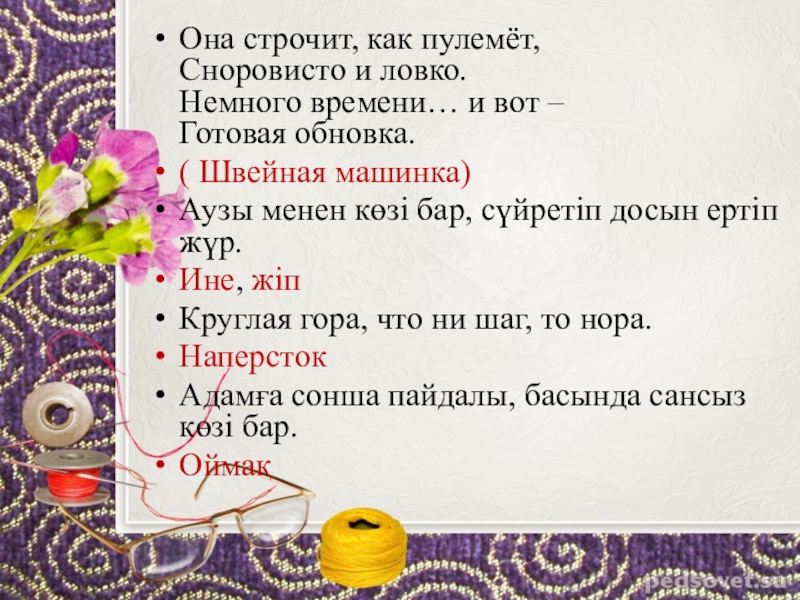 Она строчит, как пулемёт,  Сноровисто и ловко.  Немного времени… и вот –  Готовая обновка. ( Швейная машинка) Аузы
