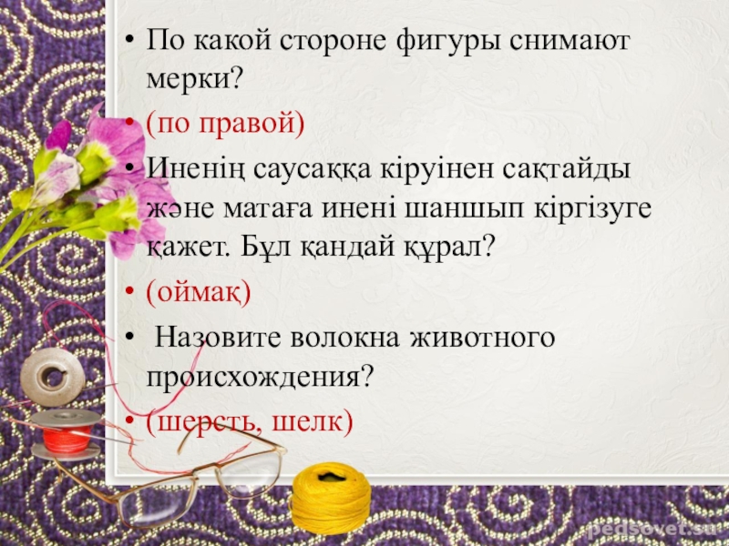 По какой стороне фигуры снимают мерки?(по правой)Иненің саусаққа кіруінен сақтайды және матаға инені шаншып кіргізуге қажет. Бұл