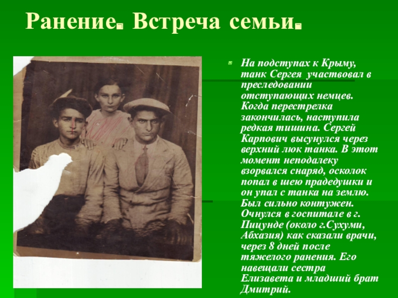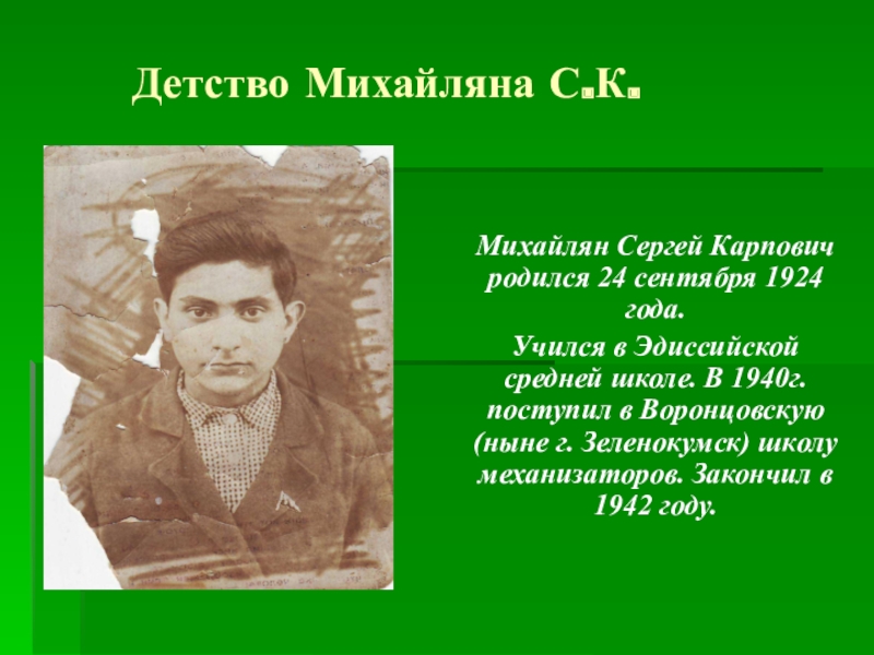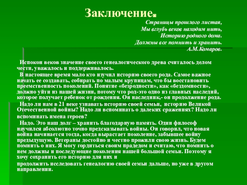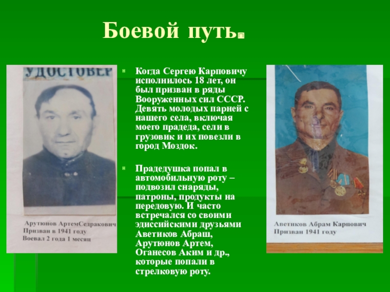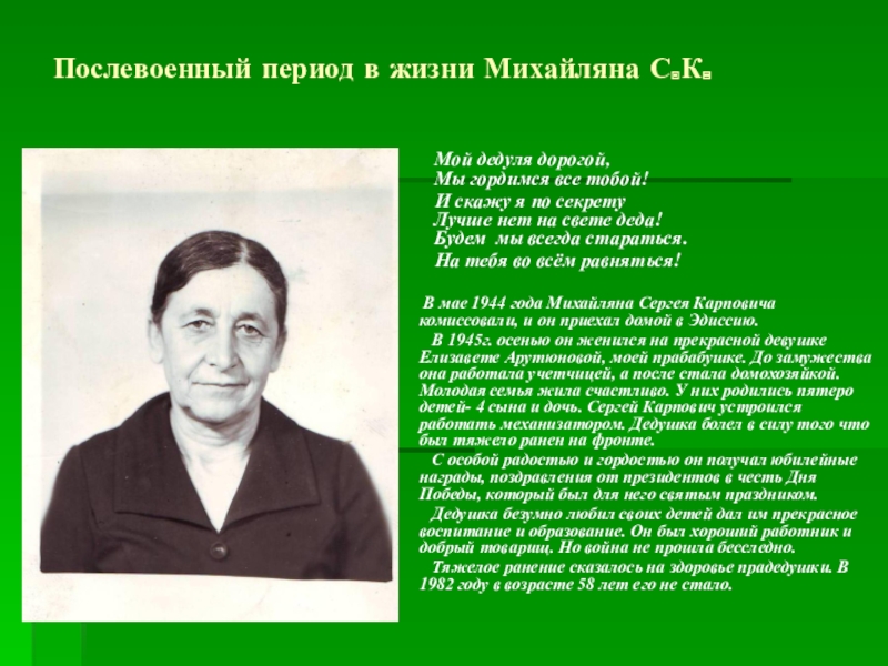 Предмет исследования: генеалогическое древо семьи Михайлян, судьба прадедушки участвовавшего в Великой Отечественной войне.
