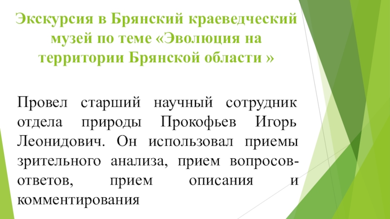 Провел старший научный сотрудник отдела природы Прокофьев Игорь Леонидович. Он использовал приемы зрительного анализа, прием вопросов-ответов, прием описания и комментирования