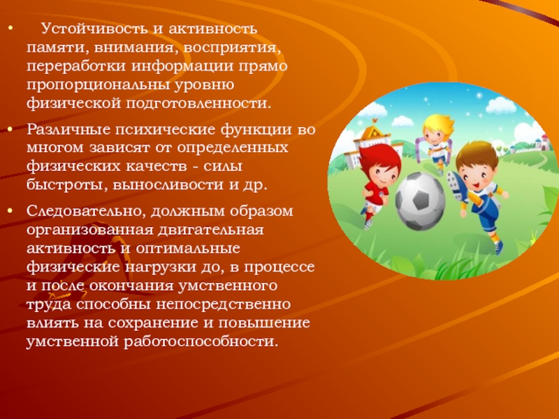 Устойчивость и активность памяти, внимания, восприятия, переработки информации прямо пропорциональны уровню физической подготовленности. Различные психические