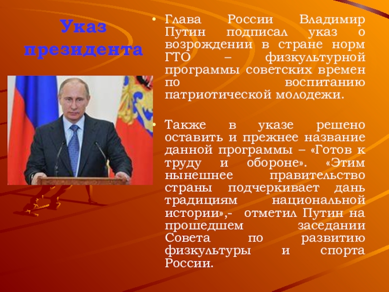 Указ президентаГлава России Владимир Путин подписал указ о возрождении в стране норм ГТО – физкультурной программы советских