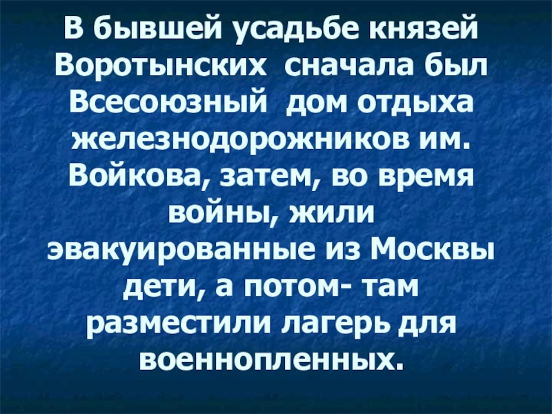 им.Войкова, затем, во время войны, жили эвакуированные из Москвы дети, а потом- там разместили лагерь для военнопленных.