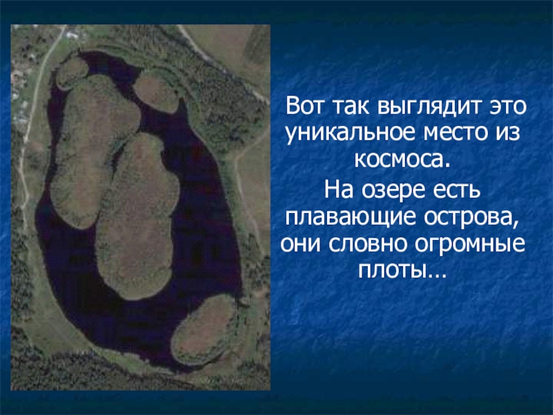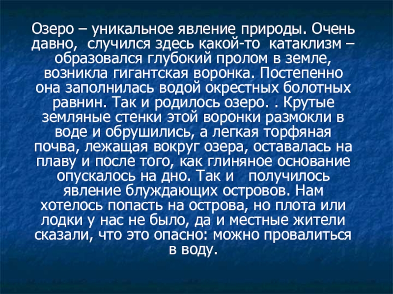 – образовался глубокий пролом в земле, возникла гигантская воронка. Постепенно она заполнилась водой окрестных болотных равнин. Так и родилось озеро. . Крутые земляные стенки этой воронки размокли в воде и обрушились, а легкая торфяная почва, лежащая вокруг озера, оставалась на плаву и после того, как глиняное основание опускалось на дно. Так и получилось явление блуждающих островов. Нам хотелось попасть на острова, но плота или лодки у нас не было, да и местные жители сказали, что это опасно: можно провалиться в воду.