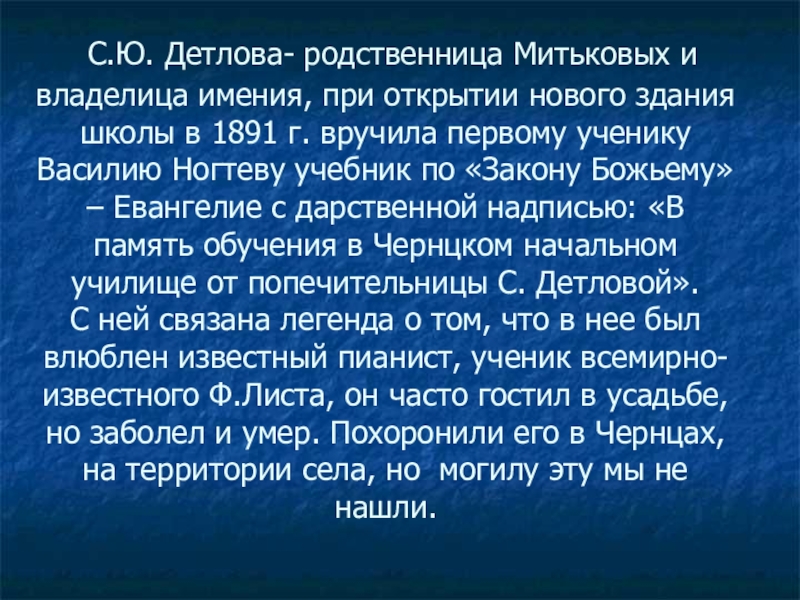Слайд 19 С.Ю. Детлова- родственница Митьковых и владелица имения, при открытии нового