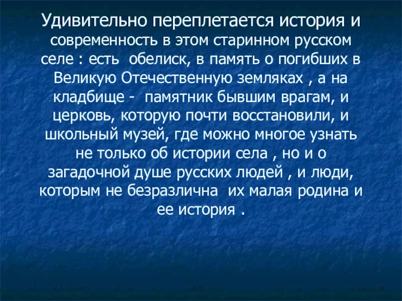 Слайд 72Удивительно переплетается история и современность в этом старинном русском селе :