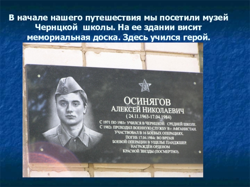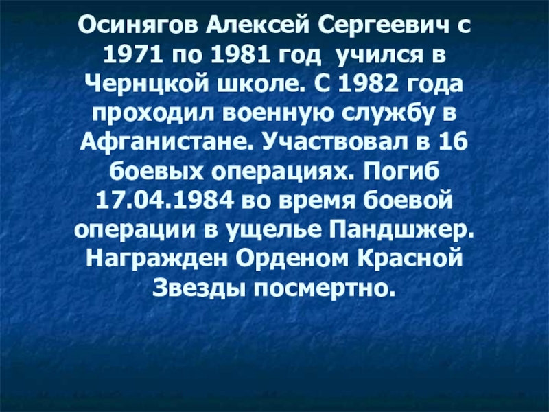 Слайд 21Осинягов Алексей Сергеевич с 1971 по 1981 год учился в Чернцкой
