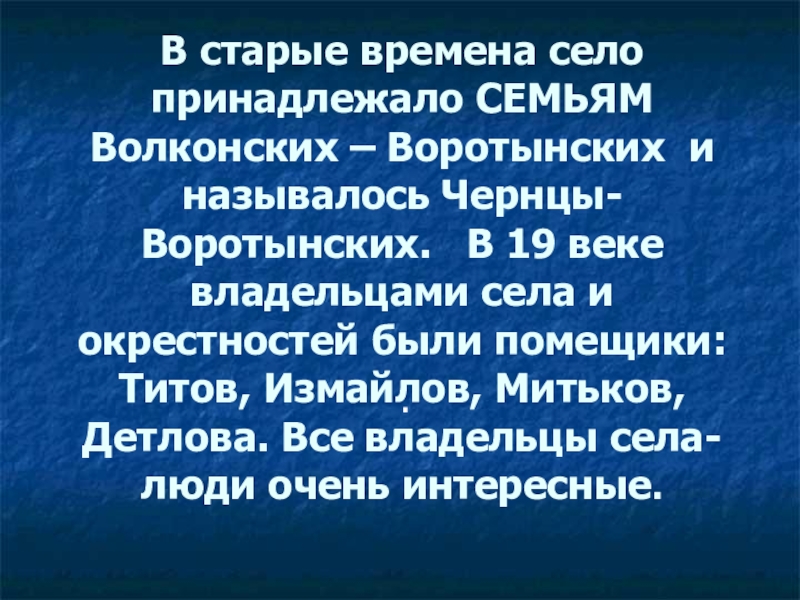 Чернцы-Воротынских. В 19 веке владельцами села и окрестностей были помещики: Титов, Измайлов, Митьков, Детлова. Все владельцы села-люди очень интересные.