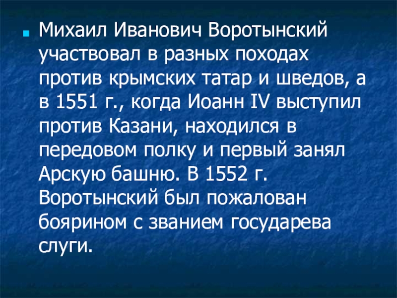 шведов, а в 1551 г., когда Иоанн IV выступил против Казани, находился в передовом полку и первый занял Арскую башню. В 1552 г. Воротынский был пожалован боярином с званием государева слуги.