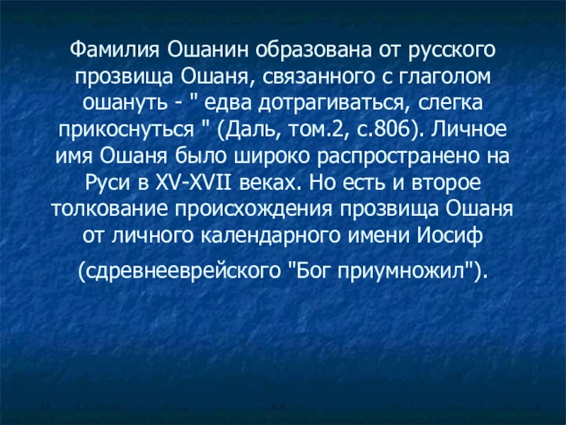 - " едва дотрагиваться, слегка прикоснуться " (Даль, том.2, с.806). Личное имя Ошаня было широко распространено на Руси в XV-XVII веках. Но есть и второе толкование происхождения прозвища Ошаня от личного календарного имени Иосиф (сдревнееврейского "Бог приумножил").