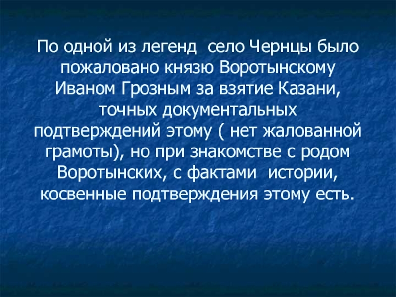 Слайд 7По одной из легенд село Чернцы было пожаловано князю Воротынскому Иваном