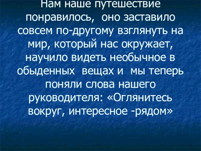 Слайд 73Нам наше путешествие понравилось, оно заставило совсем по-другому взглянуть на мир,