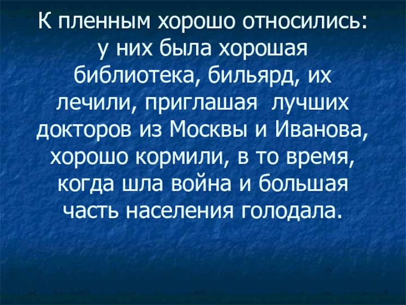 Слайд 42К пленным хорошо относились: у них была хорошая библиотека, бильярд, их