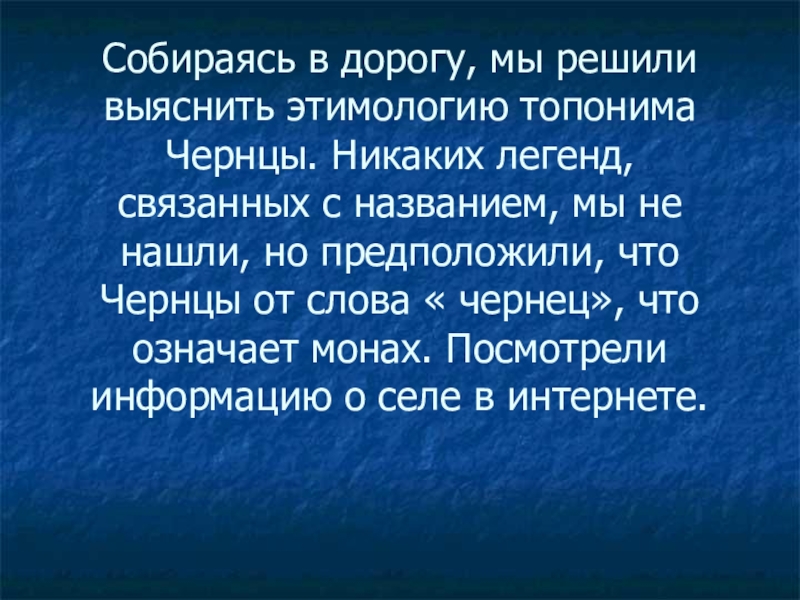 Слайд 3Собираясь в дорогу, мы решили выяснить этимологию топонима Чернцы. Никаких легенд,