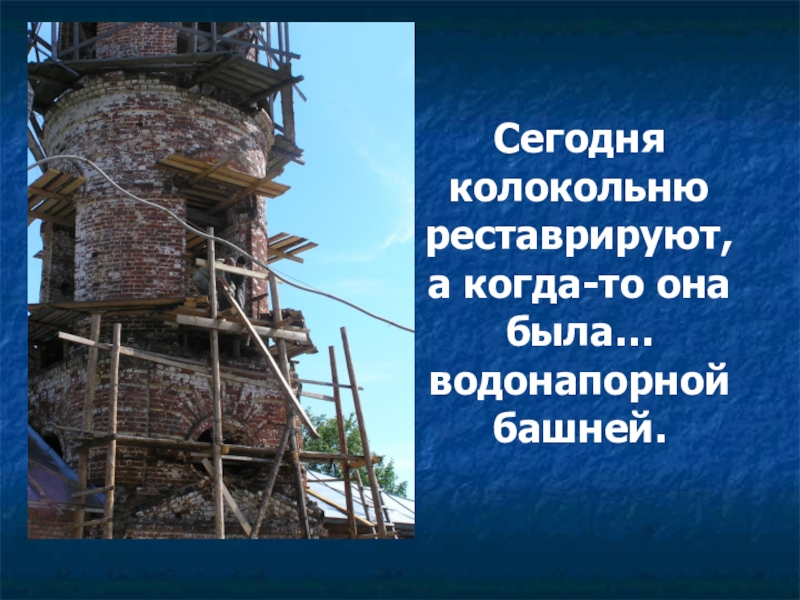 Слайд 35Сегодня колокольню реставрируют, а когда-то она была… водонапорной башней.